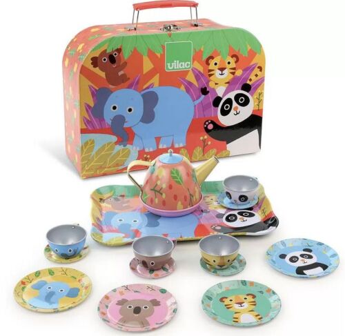 Pribor za čaj u ovom setu napravljen je od metala i sadrži 4 šoljice i 4 tacnice, poslužavnik, čajnik i 4 tanjirića, a sve to dolazi u simpatičnom kartonskom koferu sa naslikanim životinjskim društvom iz džungle. Idealan za zabavnu igru čajanke, a i same životinjice na ovom priboru učiniće da se dete oseća kao da ima društvo za igru.