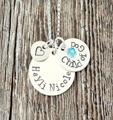 Ova ručno rađena, sa tri priveska čini lep, personalizovani poklon za krštenje. Ova ogrlica od srebra ima na sebi detetovo ime i natpis “Dete Božje”. Svaka se izrađuje po narudžbi i nalazi se na odgovarajućem lancu.